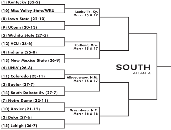 Der Süden ist namentlich durchaus als stärkstes Feld anzusehen. Dies liegt unter anderem natürlich auch am overall #1-Seed Kentucky, der trotz eines äußerst ansprechenden Non-Conference-Schedules nur zwei Mal unterlag. Bis zum Selection Sundy hatten nur die Indiana Hoosiers die Wildcats geschlagen – und dieses Team findet sich als #4-Seed auch gleich im Süden wieder. Auch Baylor als #3 hätte in allen anderen Bracket-Vierteln größere Chancen auf einen Final Four-Einzug gehabt, wenn Kentucky nicht der zugeloste #1-Seed gewesen wäre.