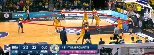 Da aber auch Günther mittlerweile mitbekommen haben sollte, dass Ohlbrecht näher zum Korb stehen sollte, um Drives zu verhindern, ist es kaum zu verstehen, wie es zu dieser Situation kommen konnte. Öfter hatten die Orangenen in diesem Spiel schon geswitcht, wenn es brenzlig wurde. Hier wäre dies ebenfalls sinnvoll gewesen, damit Ohlbrecht nicht den Weg nach draußen zur Dreipunktlinie machen muss und man somit gar keine Rim Protection mehr hat. Doch Günther bleibt bei Ruoff, der in der Folge einen Screen für Ohlbrecht setzt, damit Godbold freigespielt werden kann.