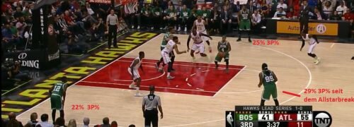 Auch hier stehen beide Guards oben am Perimeter und werden nutzlos, sodass Brandon Ashley hier zum Korb ziehen muss. Allerdings kann schon beobachtet werden, wie Voigtmann zur Hilfe kommt, um den Wurf schwerer zu machen.