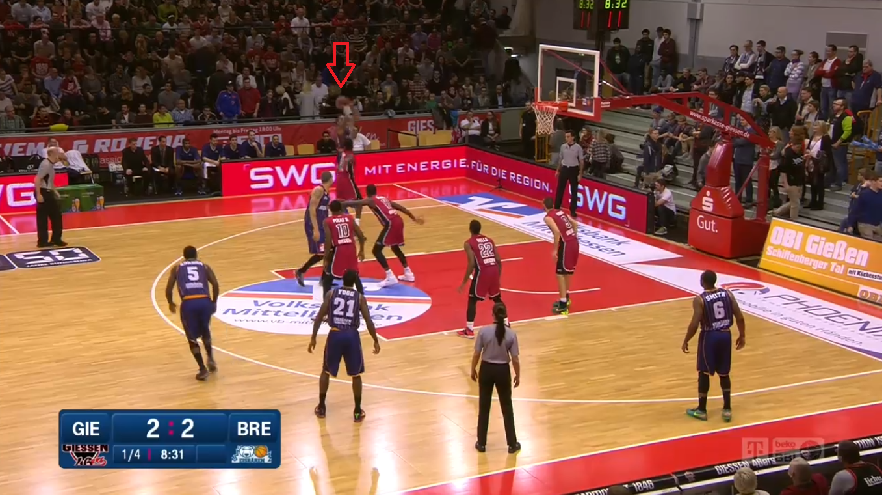 Um dem Ganzen dann die Krone aufzusetzen, schneidet Neuzugang Fabian Bleck ausgerechnet auch noch dorthin, wo Freese sich gerade hinarbeitet. Der bemalte Bereich ist nun mit vier (!) Gegenspielern bedeckt und Freese, der mit dem Rücken zum Korb steht, kann nur erahnen, wie wenig Chancen er auf einen Korberfolg hat. Des Weiteren rückt Smith nach dem Pass nicht an die Dreierlinie heraus, was es auch für seinen Defender einfacher macht zu doppeln.