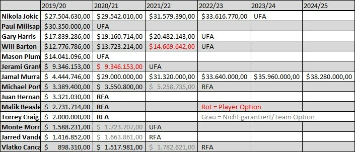 Darauf sollten sich die Nuggets aber nicht verlassen. Zum einen könnten sie durch fehlende Qualität auf dem Flügel ihre Chancen auf einen Titel reduzieren – schließlich muss ihr Small Forward in den Playoffs möglicherweise Kawhi Leonard, LeBron James oder James Harden verteidigen. Zum anderen würden vor allem Porter und Hernangomez durch ein Festhalten an der aktuellen Teamstruktur vermutlich in ihrer Entwicklung blockiert. Daher sollten die Nuggets jetzt und in den ersten Saisonspielen sowohl ihren Kader als auch den Trademarkt intensiv evaluieren. Letzteres ist ohne Insiderinformationen höchst spekulativ, aber ein detaillierter Blick auf den Nuggets-Roster erlaubt ein besseres Verständnis der Situation: Wer könnte und sollte getradet werden, wer nicht? Dazu ist erst ein Blick auf die Gehaltssituation als Ganzes sinnvoll, dann auf die Spieler im Einzelnen.