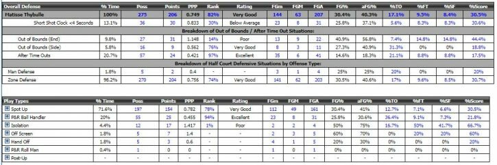 * Thybulle spielte die vergangenen beiden Jahre mehr oder minder nur Zonenverteidigung. Seine exzellenten Leistungen auf dieser Seite des Balles sind deshalb etwas mit Vorsicht zu genießen. Andererseits lieferte er als Kopf der 2-3-Zone aber auch einfach exzellente Arbeit ab (10 DBPM). Für seine Stocks-Produktion (5,8 STOCKSpG) gibt es in der CBB-Reference-Datenbank keinen sinnvollen Vergleichswert. Dies bedeutet bspw., dass auch kein Michael Carter-Williams oder Jerami Grant solche herausragenden Werte in der Syracuse-Zone auflegen konnte.