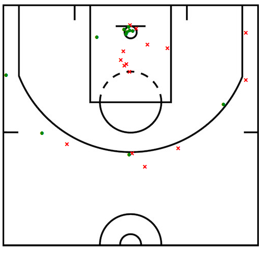 Und zumindest einige Achtungserfolge konnten die Jazz erzielen: Harden zog nur für seine Verhältnisse lächerliche drei Freiwürfe. Außerdem gelang es oft, ihn zu Würfen aus der Floaterdistanz zu zwingen, aus der er nur 1/8 FG verwandelte – hier machte sich Goberts Länge bemerkbar. Insgesamt erzielte Harden „nur“ 29 Punkte, versuchte 10 Dreier (von denen er 4 traf) und legte ein ORtg von 115 auf – alles teils deutlich unter seinem Saisonschnitt. Auf diesem Shot-Chart sieht man noch einmal deutlich, aus welchem Bereich Harden schwächelte: