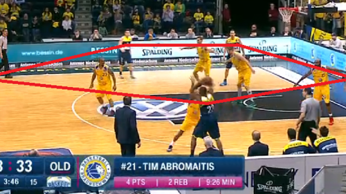 Da aber auch Günther mittlerweile mitbekommen haben sollte, dass Ohlbrecht näher zum Korb stehen sollte, um Drives zu verhindern, ist es kaum zu verstehen, wie es zu dieser Situation kommen konnte. Öfter hatten die Orangenen in diesem Spiel schon geswitcht, wenn es brenzlig wurde. Hier wäre dies ebenfalls sinnvoll gewesen, damit Ohlbrecht nicht den Weg nach draußen zur Dreipunktlinie machen muss und man somit gar keine Rim Protection mehr hat. Doch Günther bleibt bei Ruoff, der in der Folge einen Screen für Ohlbrecht setzt, damit Godbold freigespielt werden kann.